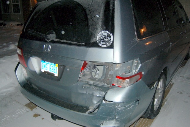 We weren't wise enough to let the snow forecasts cancel our trip to Knoxville. The roads were pretty bad tonight, and someone rear-ended us on I-75 near Detroit. Thankfully, we weren't going very fast (due to slippery conditions and heavy traffic), and no one was hurt. We also weren't smart enough to keep the car running, so we drained the battery waiting for the police to arrive. The vacation is now a stay-cation at Grandma's.